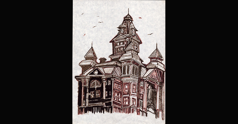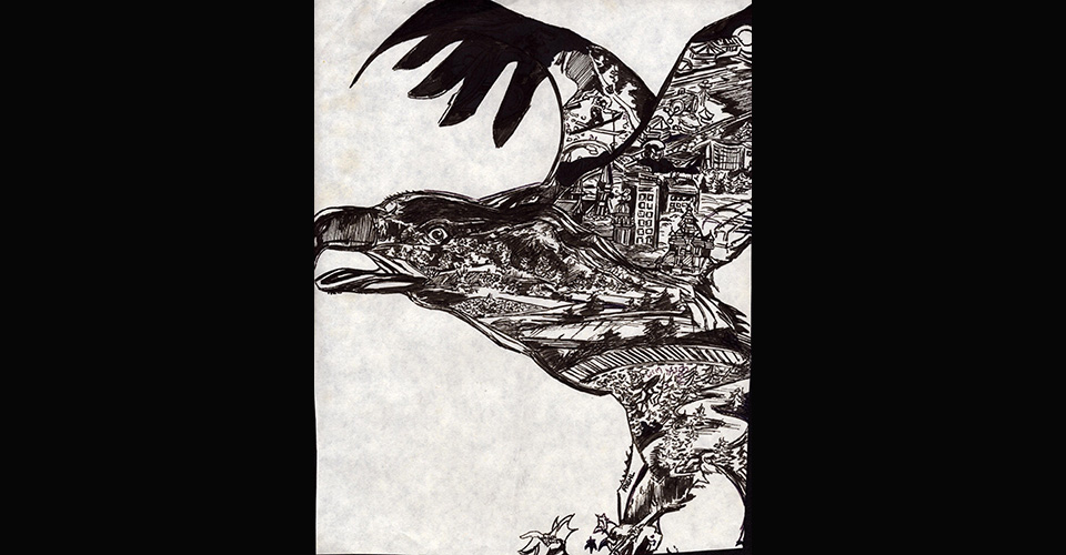 High above a city, a raven.